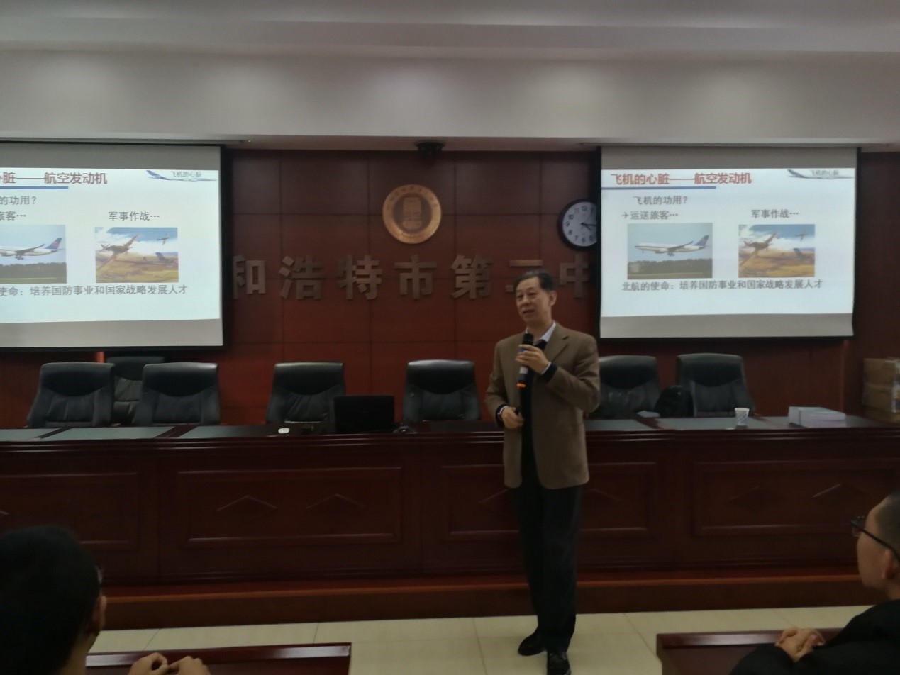 2018年12月6日,北航内蒙古招生组一行前往呼和浩特第二中学开展“教授进中学”活动。北航内蒙古招生组副组长(人文社会科学学院党委副书记)张驰老师邀请能源与动力工程学院博导教授陈志英老师作为特邀嘉宾出席本次活动。
