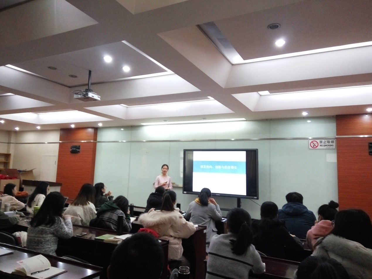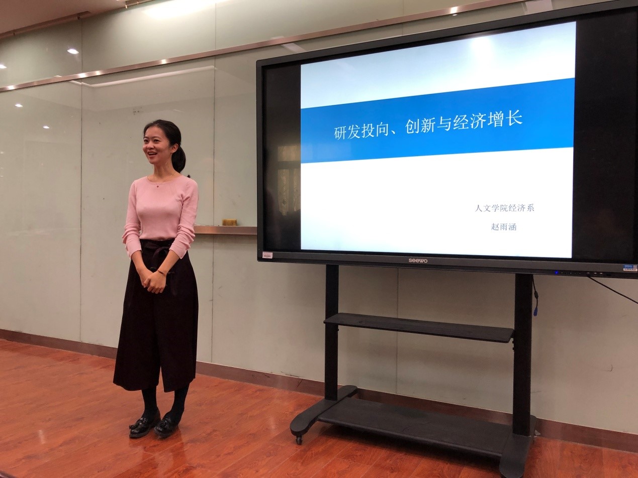 2018年11月19日星期一上午十点,人文社会科学学院研究生会学术部在院楼202室成功举办了主题为《研发投向、创新与经济增长》的专题讲座。本次讲座有幸邀请到了人文社会科学学院经济系赵雨涵老师,赵老师运用理论与实证相结合的方法向我们展示了研发投向、创新与经济增长的关系。