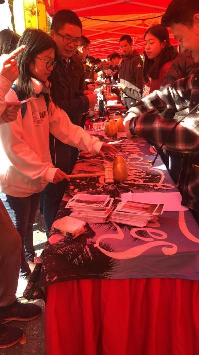 值此校庆节日,两个学院集思广益,设计了数个活动:“双人书法”考验默契合作,“你画我猜”挖掘想象空间,“穿越火线”令人聚精会神,“金蛋答题”更是妙趣横生。此外,顺利通关者可以获得参与娃娃机、投篮机活动的机会,赢得精美礼品,系列活动广受欢迎。