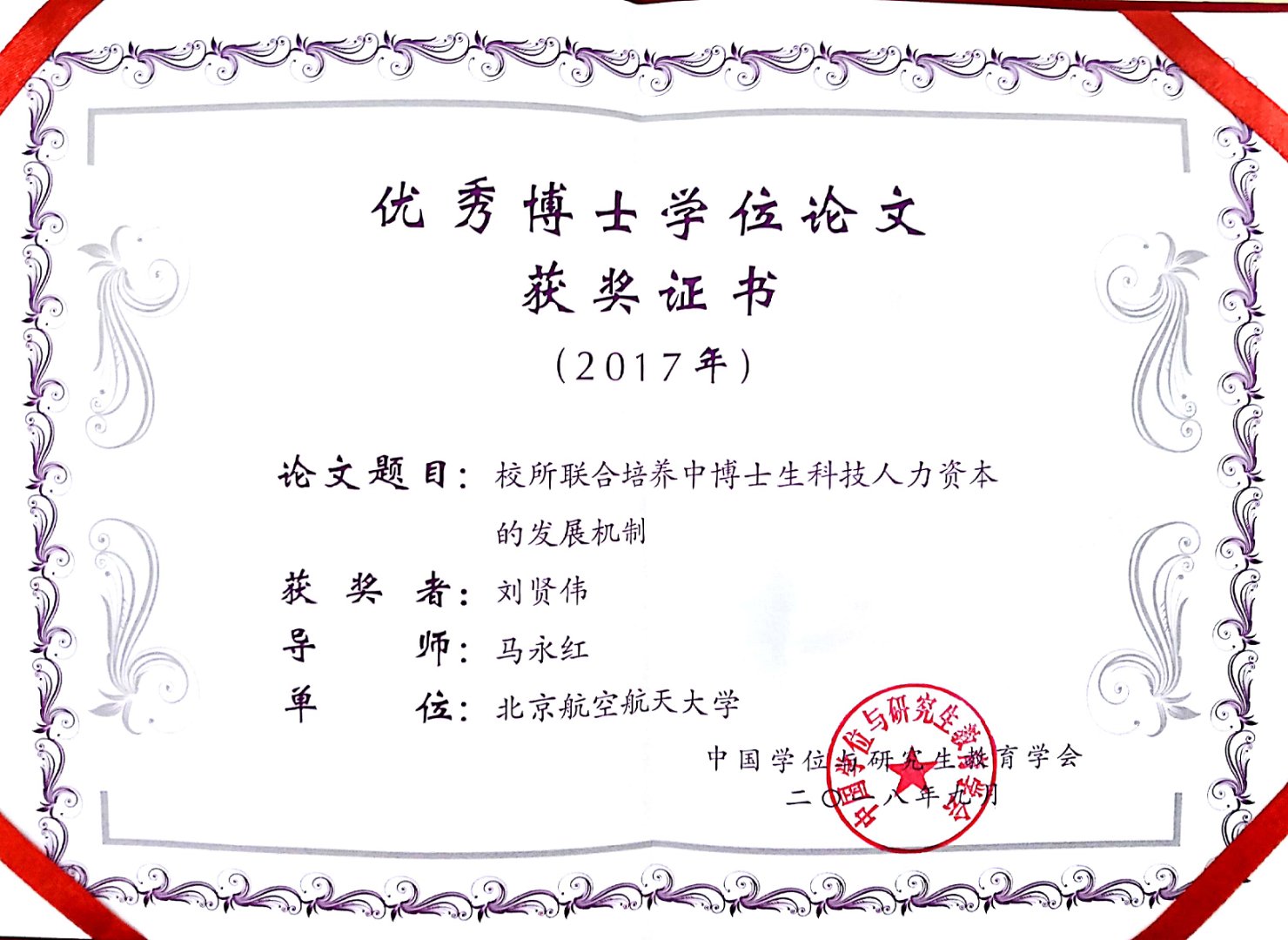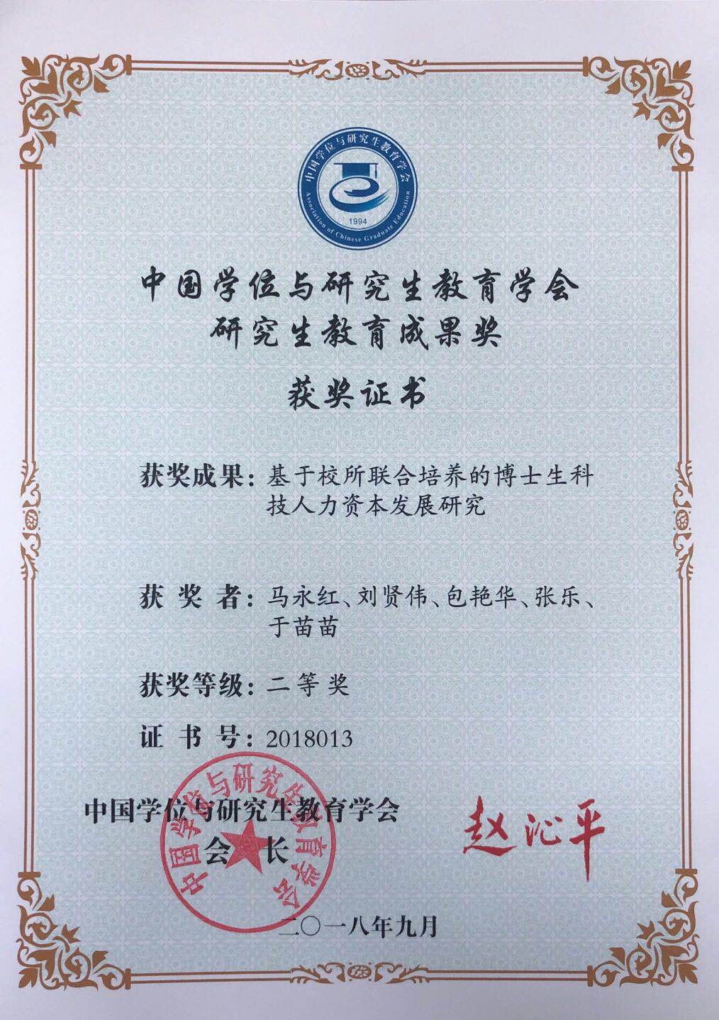 我国“高校与科研院所”联合培养博士教育试点,为拔尖创新人才培养提供了新的思路。博士生教育作为高等教育的最顶端,校所联合培养作为一种博士生培养方式仍然需要回答“培养什么样的人才,怎么培养人才的根本性问题”,我校人文社会科学学院马永红等人所展开的系列研究对上述问题进行了回答,关注校所联合培养博士生这种教育模式是否会成为博士生人力资本构建、价值实现和增值的一种重要形式。该成果在研究生人才培养方面,取得了显著效果。相关成果成为教育部与中国工程院联合培养研讨会的重要会议资料,改革建议已获教育部学位管理与研究生教育司采纳。发表《Studies in Higher Education》的SSCI检索论文1篇, CSSCI检索论文9篇。同时,马永红教授在教育理论和教育方法研究工作中开拓创新做出突出贡献取得显著成效,荣获学会第二届学术贡献奖,全国至今仅有九人获此殊荣。马永红教授所指导的博士生刘贤伟的博士学位论文获得2017年第七届学会全国优秀博士学位论文。2018年10月16日在北京举行的中国学位与研究生教育学会会员代表大会对以上奖项予以了颁奖。