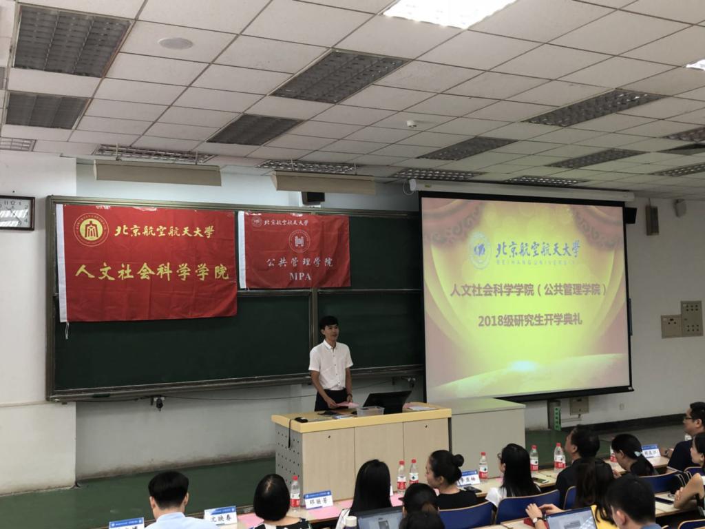 新生代表、MPA专业研究生张同玉代表全体MPA同学对学院和老师的倾力帮助表达了真挚的感谢,希望各位新同学都能够不迷茫、不浮躁、不狭隘,在北航不断进步。