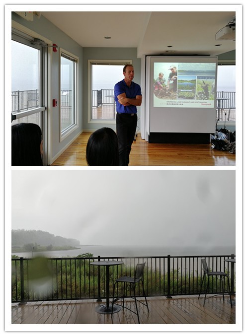 随后,大家又来到负责奥侬达噶清理项目的霍尼韦尔公司所在地,就在烟雨迷蒙的奥侬达嘎湖边的房子里,公司社区关系经理结合视频向大家展示了湖水清理的技术以及取得的成果,他表示霍尼韦尔公司在去年已完成既定的清理任务,在未来的时间里会继续对湖水水质、岸边植被覆盖及周边栖息地动物种类进行监测,生态系统的恢复需要时间,而霍尼韦尔公司会一直坚守承诺。同时也呼吁社区居民和政府共同参与到奥侬达嘎湖的建设和发展中。外面湖水水平如镜,水质清澈,还有很多一群群叫不出名字的水鸟在湖边大摇大摆地走来走去,完全看不出原来严重污染的痕迹。