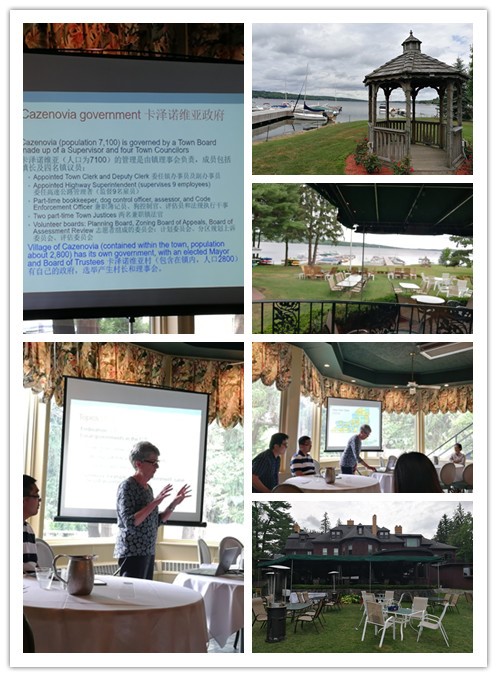 上完课,我们马上前往卡泽诺维亚小镇,来到奥侬达嘎湖边的一个餐馆,湖水与蓝天白云交相辉映,帆船在粼粼的波光中时隐时现。马克斯韦尔学院公民权与民主普查家族讲席教授、政治学系荣休教授安德森博士为我们上了一堂生动有趣的课程《公开而高效的地方政府》。安德森博士结合自己的实践经验,讲述了地方政府如何开放高效地运转,并就奥侬达嘎湖污水治理、葡萄园噪声治理的具体案例,分析了州政府与镇政府的相互关系。体会感悟:安德森博士是雪城大学马克斯维尔学院的最受欢迎的前系主任之一,又担任过镇政府的官员,治理理论与实践经验相结合,很有学术研究理论水平,又有基层政府实践经验,让人强烈感受到原汁原味的美国本土治理理论与实践相结合的典型范例。我提问安德森教授:她授课内容中的dog control officer是做什么的?她告诉我们:这是镇政府里专门管理镇里每一条狗的出生、卫生防疫、甚至处理狗狗打架纠纷等的镇政府工作人员,我不由得感叹美国地方政府很强的自治能力、治理的严谨与周密细致;我还请教的问题是:您如何看待地方政府的discretion(自由裁量权)?教授也都耐心给了回答……窗外,是奥侬达嘎湖,碧水蓝天,帆船点点,让我们见识了这个湖的美丽,我们根本没想到这个湖以前的污染程度是何等触目惊心,这个湖也为后一天的环境污染学习课程埋下了伏笔(佩服课程设计者的独具匠心)。