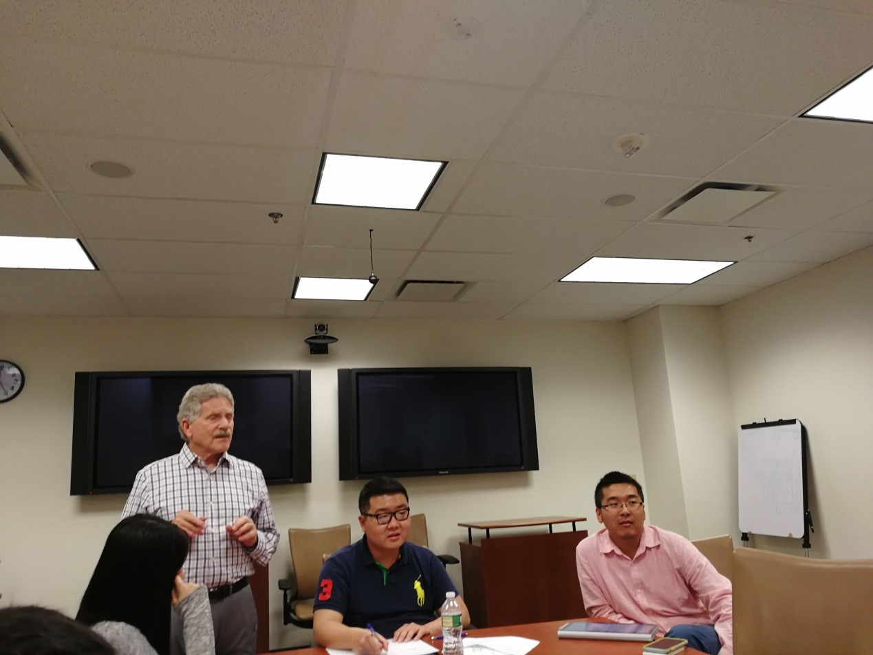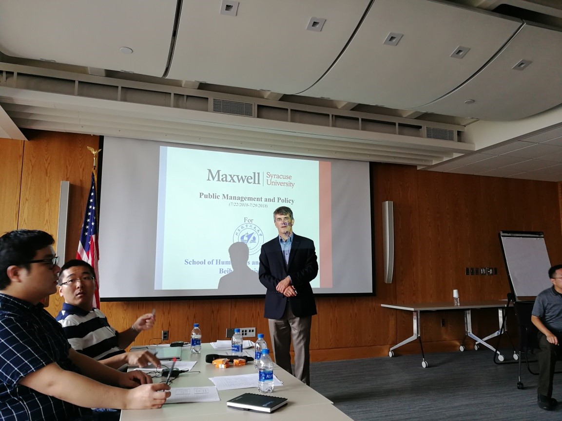 首先是本项目的开班仪式。雪城大学马克斯韦尔公民与公共事务学院高级公共管理教育主任Steve Lux教授对同学们的到来致欢迎词,师生互做自我介绍,这次访学交流项目的雪城大学总策划陈学毅老师、雪城大学北京中心主任童海燕老师、北航教授兼富布莱特访问学者李亚老师,以及翻译郑博和张佳翼等,都做了热情洋溢的发言,大家在互动中更添温馨亲近。Steve教授详细介绍了锡拉丘兹市和雪城大学的成立背景、历史文化、教育教学、师资与校友以及本次项目的目标和主要内容。体会感悟:雪城大学Maxwell学院历史悠久、学术氛围浓厚、成果卓著,公共管理专业之盛名名副其实。Steve教授的学识渊博、谈吐幽默、风度儒雅、和蔼可亲,让大家领略了名家风采。