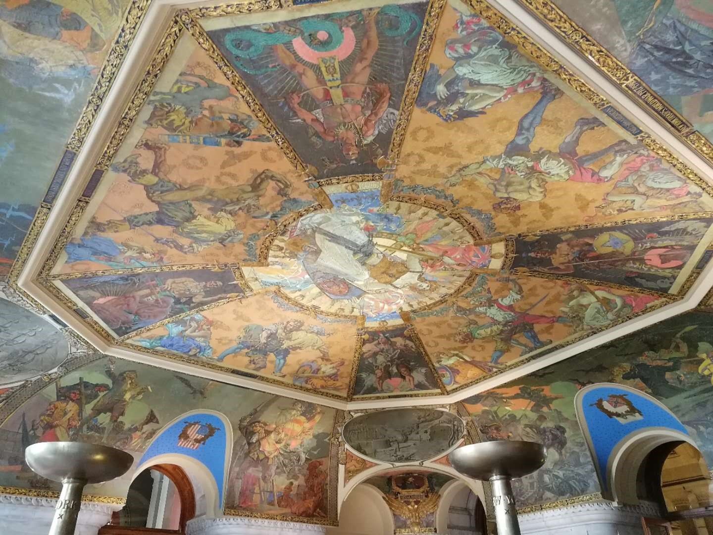 接着大家参观了纽约州议会大厦,在众议院,参议院,议员活动区等区域中行走,犹如在琳琅满目的艺术丛林中穿行,到处都有精美的手工雕刻、错综复杂的楼梯和优美的艺术品。美式建筑风格实际上是一种混合风格,它在同一时期接受了许多种成熟的建筑风格,相互之间又有融合和影响。具有注重建筑细节、有古典情怀、外观简洁大方,融合多种风情于一体的特点。体会感悟:美国纽约州议会大厦真是艺术与土豪相结合的杰作啊,仅仅一个州的议会大厦,竟然贴有23K黄金墙面,所有墙面建筑雕刻、绘画、艺术品都是纯手工打造,耗时几十年,前后历经三个设计师才把它完成,如此华丽堂皇的州议会大厦,是美国预算法案还未出台才能有的杰作(现在美国各种预算法案健全,怕是不允许再建筑这样奢侈的建筑艺术品了),这是美国资本原始积累时的见证,却也留下了千古建筑经典!