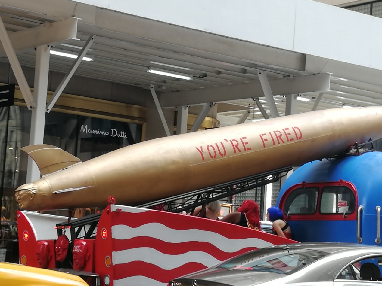 华尔街座落在曼哈顿南区,美国10大银行中的6家总行设在这里,被视为美国金融帝国的象征;自由女神像作为美国的象征,穿着古希腊风格服装,头戴光芒四射冠冕,七道尖芒象征七大洲,右手高举象征自由的火炬,左手捧着一块铭牌,上面刻着July IV MDCCLXXVI(1776年7月4日,《独立宣言》颁发的日期),表达美国人民争取民主、自由的崇高理想;纽约证券交易所是世界第二大证交所,它曾是最大的交易所,全球市值为15万亿美元;第五大道,从洛克菲勒中心到57街,经典的纽约百货商店与华丽的国际设计师时装店和本身就是个亮点的大型旗舰店融合在一起;帝国大厦(Empire State Building),是美国纽约的地标建筑物之一,它是保持世界最高建筑地位最久的摩天大楼(1931-1972共41年);中央公园,在市区中心有一片长方形的绿荫被众多拔地而起的高楼环抱,这就是有“纽约绿洲”之称的中央公园,整个公园大得惊人,南北长4公里,东西宽800米,占地面积达843英亩,有茂密的树林,湖泊和草坪,甚至还有农场和牧场;联合国总部,座落在纽约东河之滨,占了6个街段,由39层联合国秘书处大楼、联合国大会及安全、经社和托管理事会会议楼、图书馆组成,被称为“国际领地”,总部正面广场上飘扬着联合国成员国的国旗,有来自各国的5000多名工作人员在这里工作。尤其让我们忍俊不禁的是,我们在第五大道的奢侈的摩天大楼旁边,看到竟然有几个穿着前卫的女子一边不慌不忙地开着游行车,一边大声抗议特朗普,游行车上有一个几乎长达八米的金色导弹模型,导弹尾部是一个被撞飞的特朗普头像,导弹的正身上面刻着几个大字:“you’re fired!(你被解雇了!)”。而特朗普大厦下的安保人员和路上行人都是一脸平静或微笑地看着,不发一言,不做阻拦,看来这就是美国的言论自由。