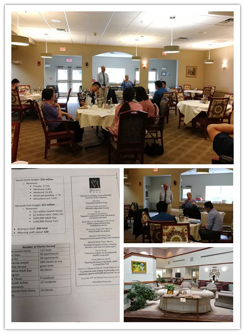 理论课程学习之后,我们立即乘坐大巴前往名为Menorah Park(烛台老人中心)的非政府组织进行实地参观,午餐也在Menorah Park进行。值得注意的是,该养老中心午餐为犹太洁食,其食物及制作方法都有特定的章程。我们一边吃午餐,一边听Menorah Park的两位负责人向我们介绍该非政府组织的具体运营情况。该养老中心主要分为三个营业模块:自费居住区域、扶助区域和医疗救助区域。根据老年人的年龄、行动能力等不同需求,提供有差异的住宿和医疗帮助。除此之外该养老中心也有一些家庭护理、日托、社区护理等小的项目。作为一个非政府组织性质的养老院,烛台老人中心也在美国医疗体系下接受一定的政府帮助,为符合医疗保险和医疗救助的人群提供高质量的医疗保障服务。随后我们参观了该中心。参观过程中,我们对美国的医疗保障体系、该中心的养老服务质量以及犹太人的生活习惯有了更加深刻的理解。体会感悟:美国的养老服务是很人性化、很贴心的,比如对老人图书馆的设立(有馆际互借)、对那些身体行动能力差、容易发生跌倒等意外老人的处理(不是限制其行动,而是手腕佩戴一种科技装置自动提示给工作人员)、对那些来探望老人的家属设立了专门的餐饮处、购物中心(上面还有“让你的老公为你买买买”之类风趣的话语)等,都让人感受到对老人的尊重和人性化的关心与温暖。另外,这几天连吃饭都在听讲座,使我们感觉到行程安排真是惜时如金、紧凑衔接,连课间休息、午休打个盹的时间都是省略了啊!这个课程安排真是含金量极高!