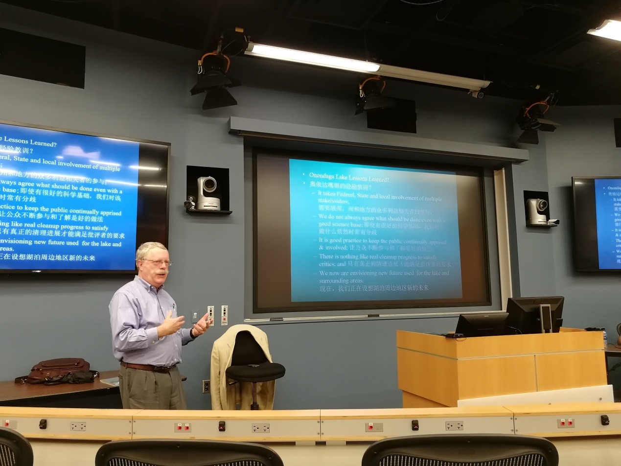 上午主要由纽约州立大学教授斯马通老师将奥侬达噶湖案例从环境污染历史、规制与清理等三个方面给大家进行讲授。教授先讲解了湖污染的历史原因,主要分为工业污染和生活污染。从1970年开始,奥侬达噶湖附近的工厂进行生产,工厂不断进行并购,工业污染也逐渐加重,1988年,大西洋州法律基金会及州相关机构提交奥侬达噶郡水质问题的诉讼,随后纽约州对此也提起诉讼,随后,纽约州、大西洋州法律基金和奥侬达噶湖就环境治理问题及其解决办法达成统一;生活污染方面,主要来自居民长期生活污水和垃圾的排放。因此治理也要从工业和生活污染两个方面进行。