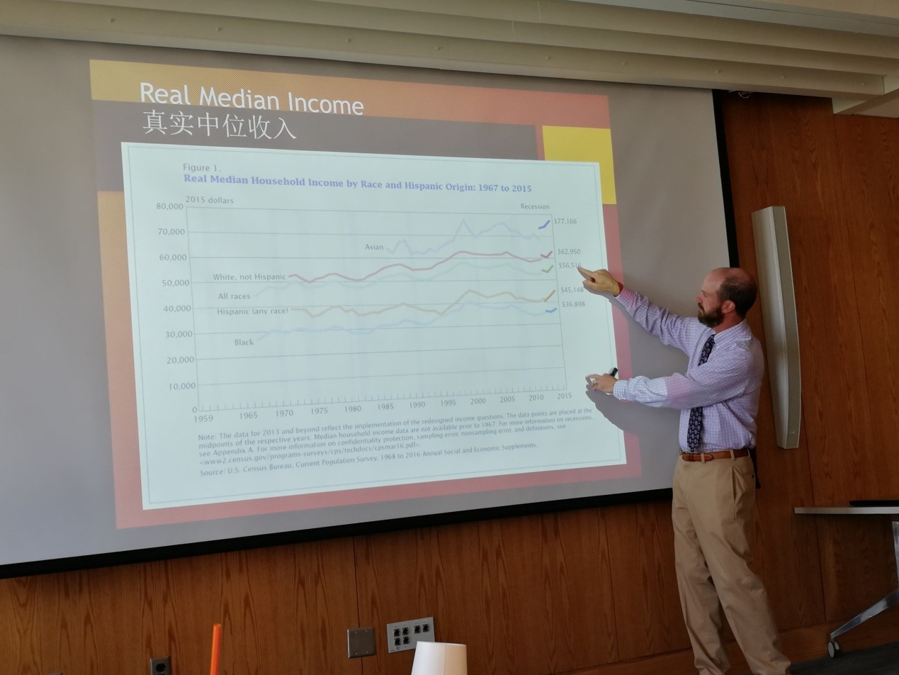 上午,在雪城大学Maxwell学院,由公共管理与国际事务系教授、政策研究中心主任洛波博士(Dr.Leonard Loppo)讲授“美国的贫困与社会福利政策”。教授首先定义了贫困,即表示一个人不能够维持最低的生活标准。接着介绍了美国贫困的地理和族群分布、原因和相关理论,同时研究了美国在联邦政府层面,针对贫困制定的一系列公共政策,包括社会保障、收入所得地税、医疗保险和医疗救助等,并在此后十五年甚至更长时间范围内研讨了这些政策的有效性。通过事例表明,政府制定公共政策时的善意,并非都能带来好的结果。体会感悟:贫困与冲突是每一个国家都无法回避的现实问题,洛波博士(Dr.Leonard Loppo)讲授对美国贫困的成因分析得入情入理,尤其是对家庭人口结构的分析,对美国减少贫困的一系列政策也分析得很到位,其中很多政策是值得借鉴的。当然,美国的种族歧视也是很严重的问题,虽然已经不再在明面上歧视其他种族,但是实际上,这种潜规则的种族歧视还是随处可见的。