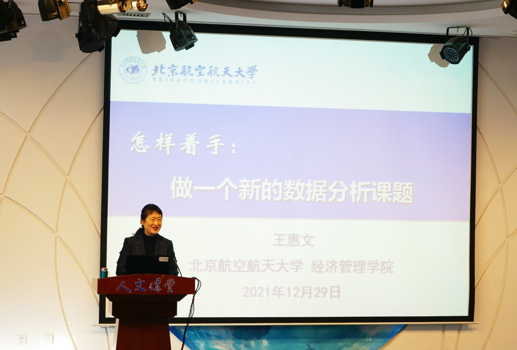 12月29日,北航“人文讲堂”学术前沿系列讲座在人文社会科学学院人文讲堂举行,本次讲座邀请了北京航空航天大学王惠文教授作题为“怎样着手做一个新的数据分析课题”的学术前沿讲座。科技部高技术中心技术总师史冬梅,学院院长蔡劲松教授,经济系韩霞教授以及科技部高技术中心-北航公共管理学院联合培养的5名博士后和100余名研究生参加本次讲座。讲座由学院党委副书记张驰主持。