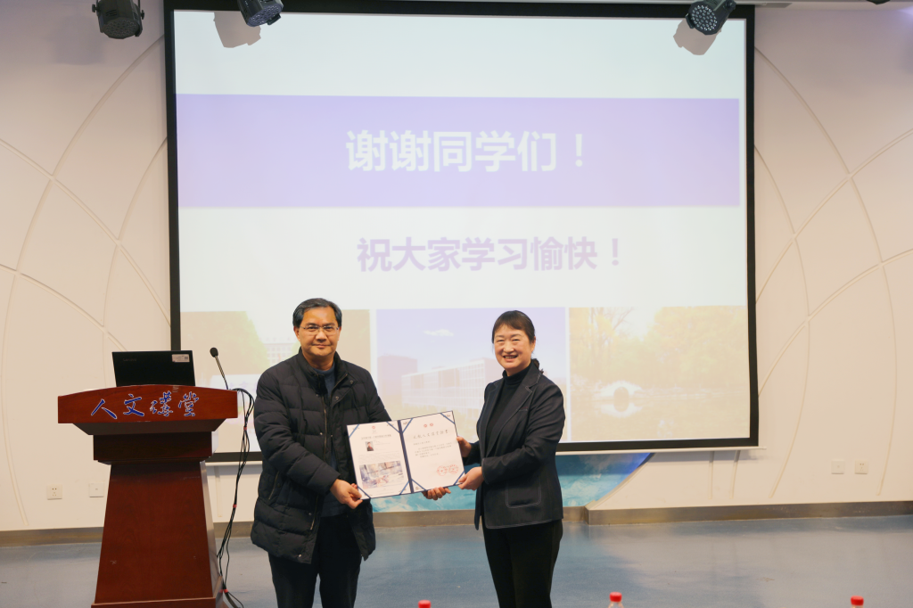 人文社会科学学院院长蔡劲松教授代表学院向王惠文教授颁发“人文讲堂”纪念证书并合影留念。