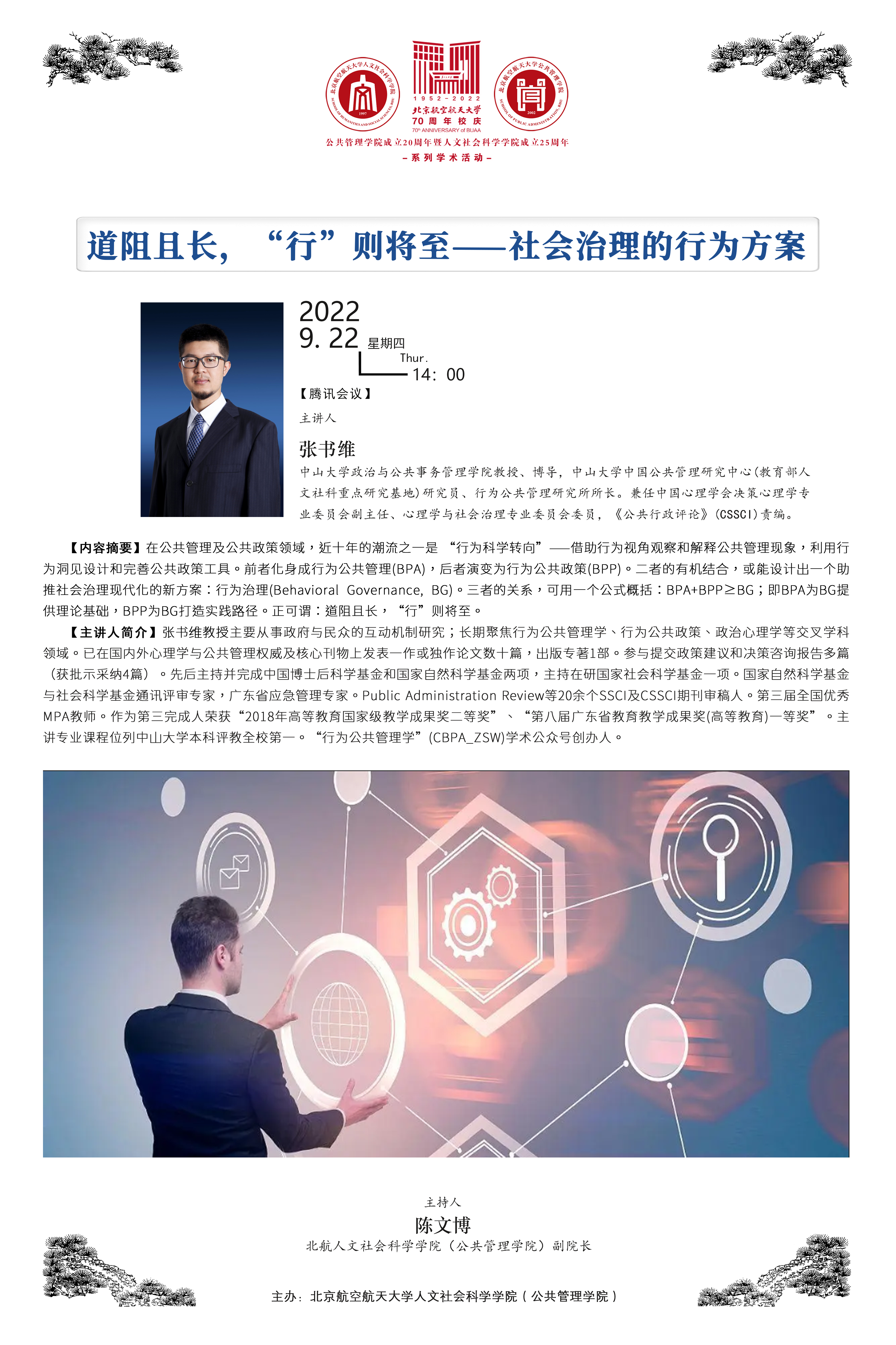 2022年9月22日下午,北航公共管理学院成立二十周年暨人文社会科学学院成立25周年系列学术前沿讲座以腾讯会议形式顺利召开。本次活动邀请到中山大学政治与公共事务管理学院张书维教授做题为“道阻且长,‘行’则将至——社会治理的行为方案”的学术前沿讲座。共有600余位师生线上参与了此次讲座,讲座由人文社会科学学院陈文博副院长主持。